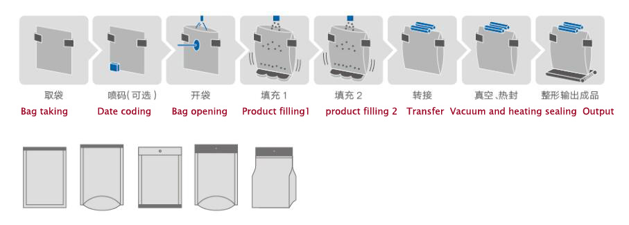 تتضمن هذه الوحدة من الآلات آلة وزن متعددة الرؤوس ZL20-1.6L لوزن منتجين مختلفين، وآلة فتح وتعبئة وختم الأكياس الدوارة ZL8-230، ورافعة دلو DT5، ومنصة وسلّم أمان. يتم التحكم في الآلة الرئيسية بواسطة نظام تحكم منطقي قابل للبرمجة من سيمنز، وتعمل بشاشة لمس. مزودة بملحقات كهربائية معروفة. تتميز بأتمتة عالية وسهولة في التشغيل. تُستخدم على نطاق واسع في مختلف الصناعات، مثل الصناعات الكيميائية اليومية، والأغذية، والصناعات الكيميائية، وغيرها.