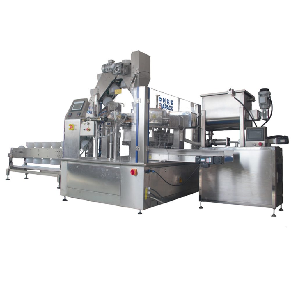 تم تصميم هذه الآلة لملء المنتج السائل الممزوج بمنتج صلب مثل , الأطعمة التي يتم طهيها مسبقًا مثل المخللات مع الحساء ، والزيتون المخلل ، والخيار المخلل ، وما إلى ذلك. مع مصعد وعاء لتغذية المنتج الصلب في كيس مسبق الصنع ثم ملء مضخة المكبس صلصة .