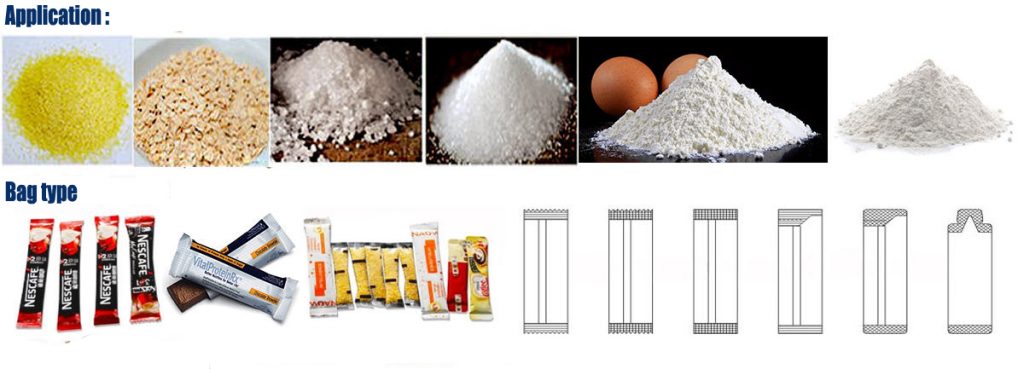هذه الآلة تستخدم أساسا لتعبئة منتجات البودرة: مثل الحليب المجفف ، مسحوق الشاي بالحليب ، مسحوق القهوة ، التوابل ، مسحوق الكاري ، مسحوق البروتين ، بهار ، مسحوق الأعشاب ، منتجات المسحوق الكيميائية والطبية.